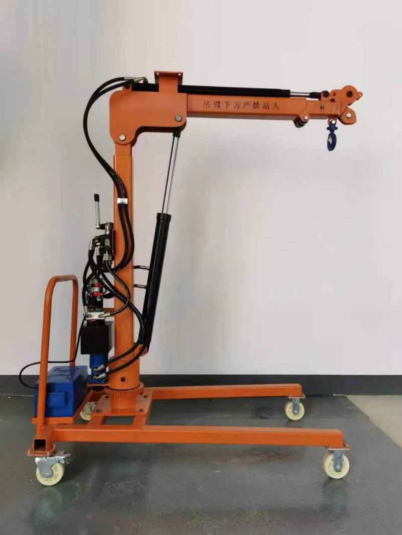 从结构来看,该吊机采用可移动底座 + 液压驱动的核心设计,底部配备万向轮,既能在车间、仓库等平坦场地灵活移动,也可快速搭载于小型车辆,实现 “随车作业、随用随吊”。橙色金属框架坚固耐用,既保障了设备稳定性,又具备良好的抗腐蚀与抗冲击能力,适配复杂作业环境。