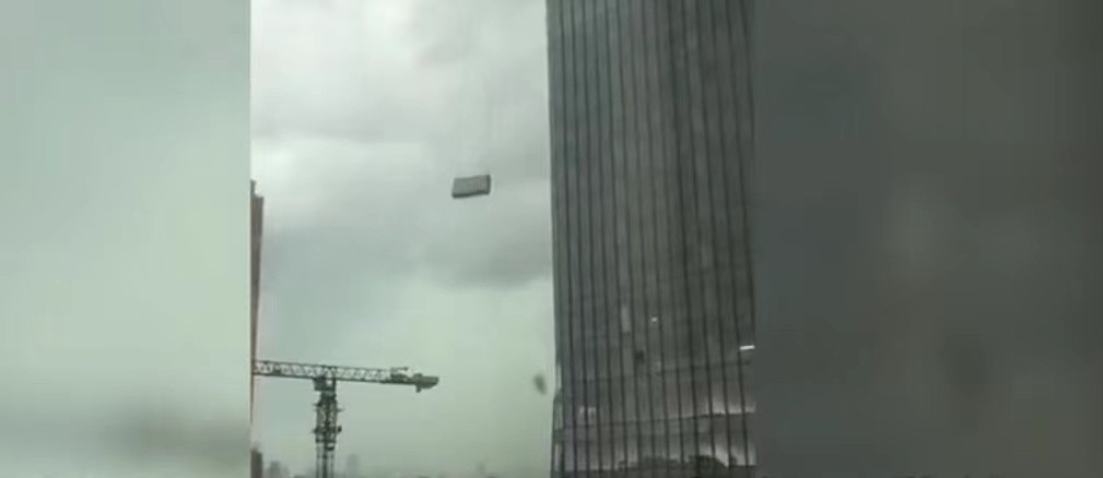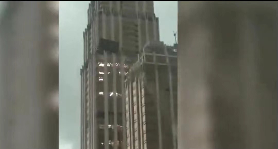 2021年5月10日武汉局部遭遇10级雷暴大风,当日13:30,湖北高艺装饰工程有限公司两名工人对三阳路幕墙工程进行保洁作业。